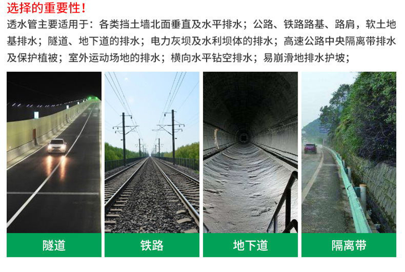 軟式透水管主要適用于:1)各類擋土墻背面垂直及水平排水;2)公路、鐵路路基、路肩,軟土地基排水;3)隧道、地下道的排水;4)電力灰壩及水利壩體的排水;5)高速公路中央隔離帶排水及保護(hù)植被;6)室外運(yùn)動(dòng)場(chǎng)地的排水;7)橫向水平鉆空排水;8)易崩滑地排水護(hù)坡;9)屋頂花園及花臺(tái)排水;10)山坡地水上保持11)整地工程的地下排水;12)低洼地排水及鹽堿地改造系統(tǒng)。