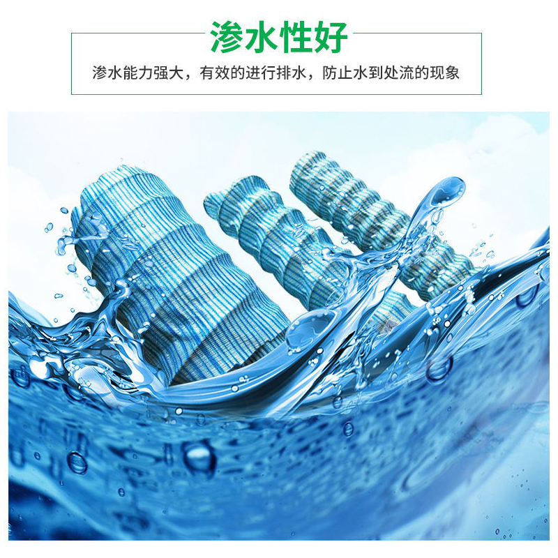 透水管是以防銹彈簧圈支撐管體,形成高抗壓軟式結(jié)構(gòu),無(wú)紡布內(nèi)襯過(guò)濾,使泥砂雜質(zhì)不能進(jìn)入管內(nèi),從而達(dá)到凈滲水的功能。滌綸絲外繞祉覆層具有優(yōu)良吸水性,能迅速收集土體中多余水份。橡膠筋使管壁被覆層與彈簧鋼圈管體成為有機(jī)一體,具有很好的全方位透水功能,滲透水順利滲入管內(nèi),而泥砂雜質(zhì)被阻擋在管外,從而達(dá)到透水、過(guò)濾、排水之目的。